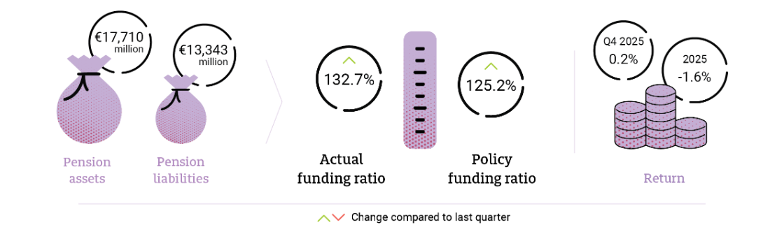 The Fund’s financial health improved during 2025. At the end of the year, we had a higher funding ratio than we did at the end of 2024, even after the full indexation at 1 April 2025. The main drivers are the higher interest rates and the financial markets’ recovery during the year after the market dip in April. The higher funding ratio means a stronger financial buffer, which is important for getting all our members off to a strong start under the NexT Pension scheme on 1 January 2027. Even so, we remain cautious. The developments around the world are difficult to predict, and that uncertainty could impact our financial position as well. We remain constantly alert to our goal of protecting the financial buffer. |